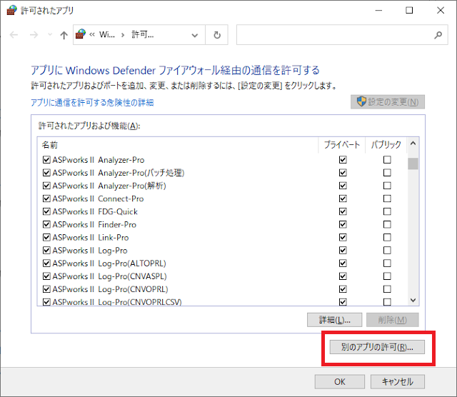 「許可されたアプリおよび機能」にASPworksⅡアプリが登録されていないか、現在使用しているネットワークにチェックが入っていない場合、「設定の変更」を行ってください。